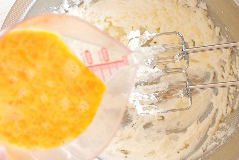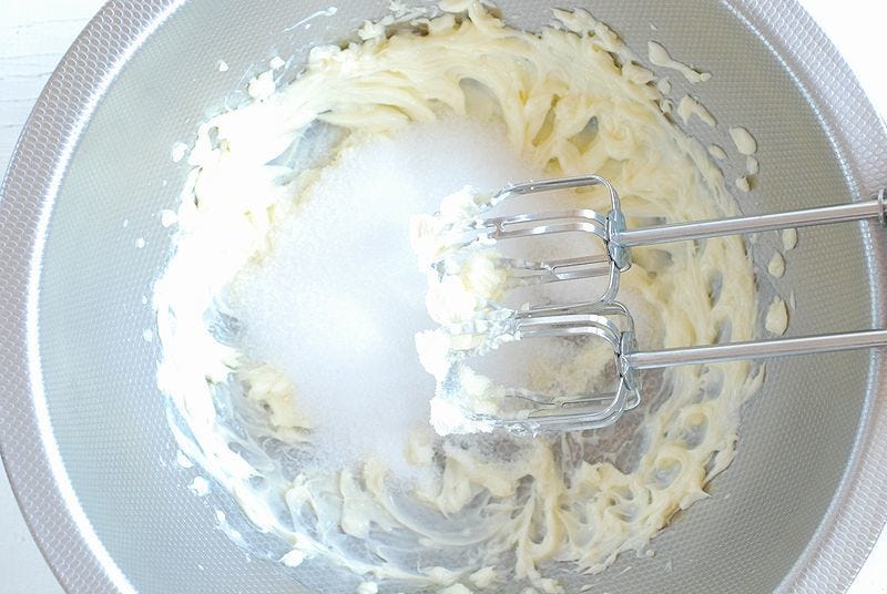 ② 別のボウルにバターと砂糖を入れ泡立て器でふんわり白っぽくなるまでよく混ぜる。