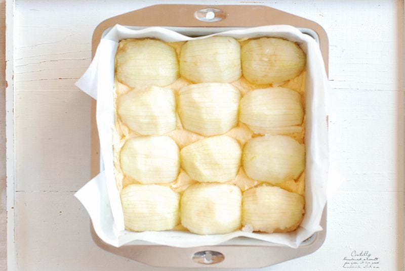 ⑤ 型に生地を流しいれて、上にりんごを生地に差し込むように置く。りんごのボウルに残った果汁や砂糖をりんごの表面にゴムベラで塗り、オーブンで約55分、中に火が通るまで焼く。