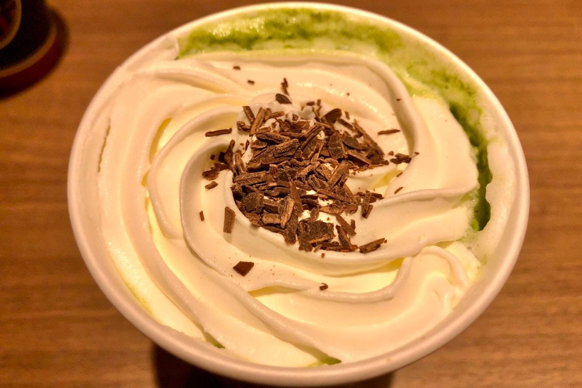 ホイップクリームと抹茶ラテの上に、削ったクーベルチュールチョコが乗っていて美しい...!