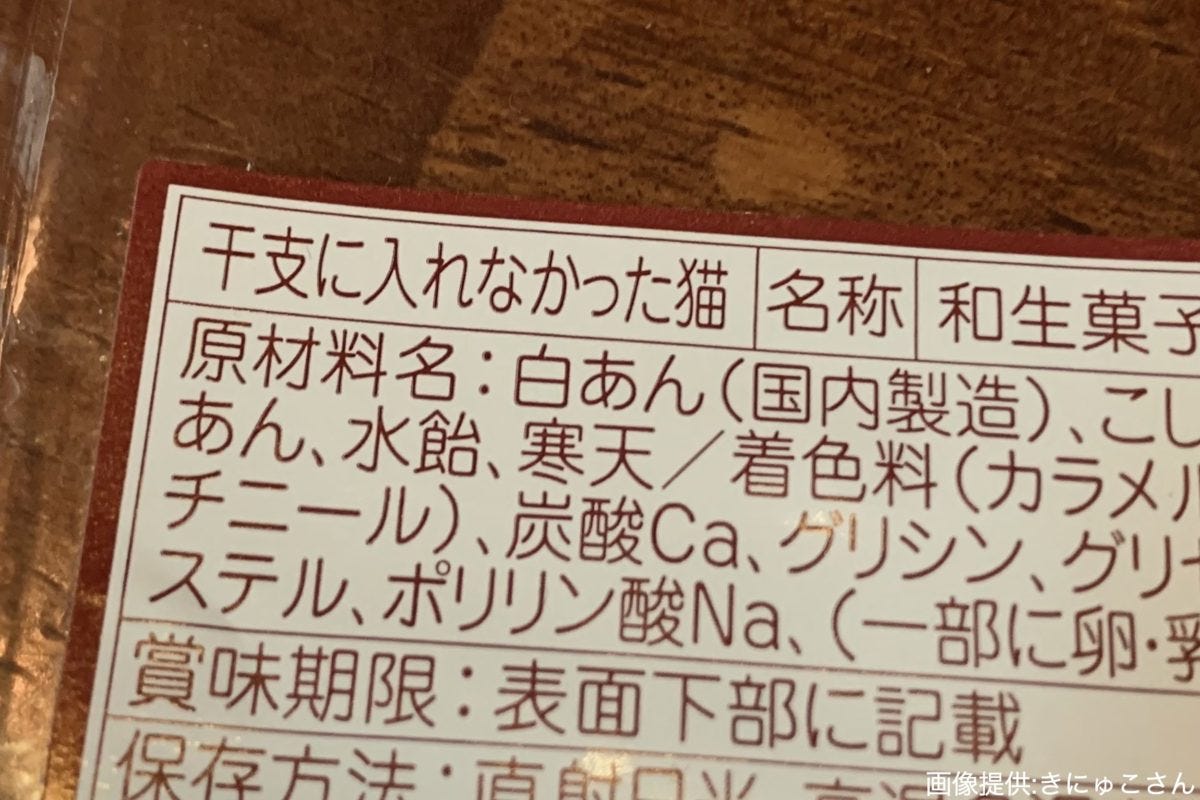 原材料名や賞味期限が記載されているが、注目すべきは左上にある「干支に入れなかった猫」という切ない商品名。そう、今年の干支である寅(トラ)をモチーフにしているように見えたこの和菓子は、寅ではなく猫であったというのだ。