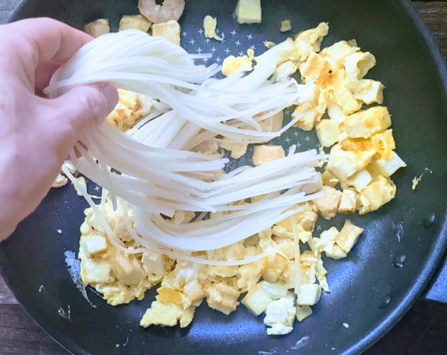 ④ 米麺を加えて炒め合わせ、②を加えて弱火にし、絡めながら炒める。ピーナッツ、さくらえび、もやし、細ねぎを加えて強火にし、手早くまぜて火を止める。