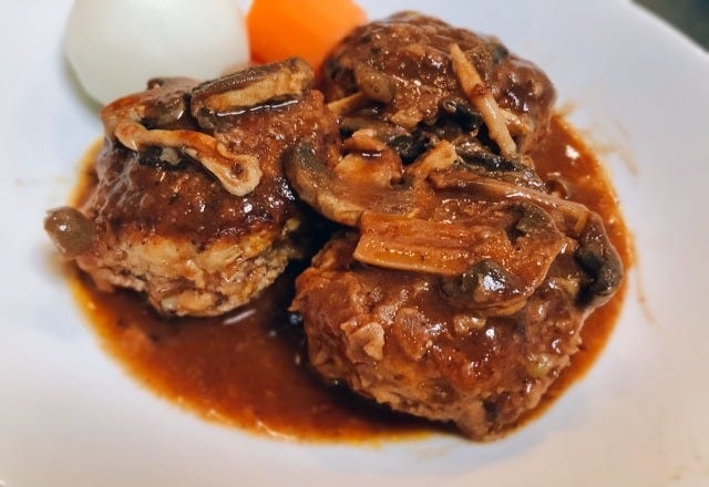 コストコの合挽肉で作るワインたっぷりの煮込みハンバーグは、ふっくらとしておいしいです♪