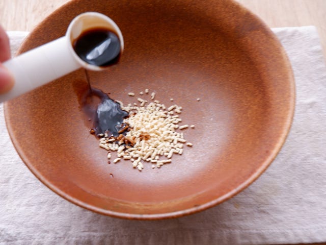 ② 器に熱湯、鶏ガラスープの素、醤油、にんにく(すりおろし)を加えて混ぜ溶かし、ごま油を垂らす。
