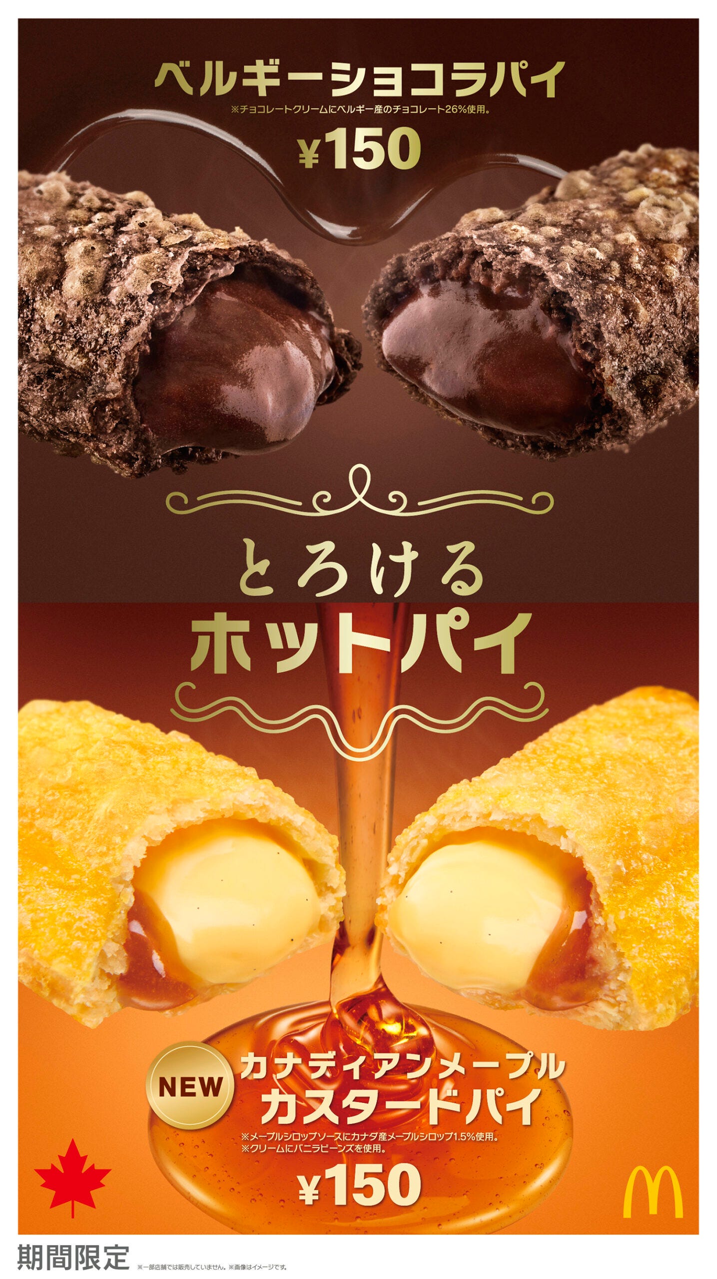 サクサクのパイ生地に相性抜群のフィリングを詰めたマクドナルドの人気のパイシリーズに、今年は新作の「カナディアンメープルカスタードパイ」と、2020年の初登場以来好評の「ベルギーショコラパイ」の、2種の「とろけるホットパイ」が登場。