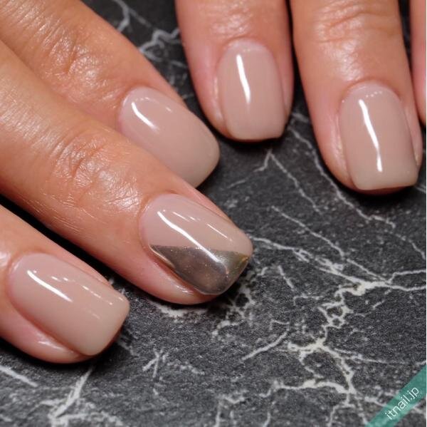 ミラーパウダーを使用してメタリックな質感を取り入れるベージュネイルは、ちょっぴりクールにキメたいときにオススメ。全面的にミラーアートを施すのではなく、斜めにスタイリッシュに取り入れるとこなれ感アップ。ミラーパウダーはカラーも豊富なので、お好きなカラーでアレンジしてみるのもアリ◎