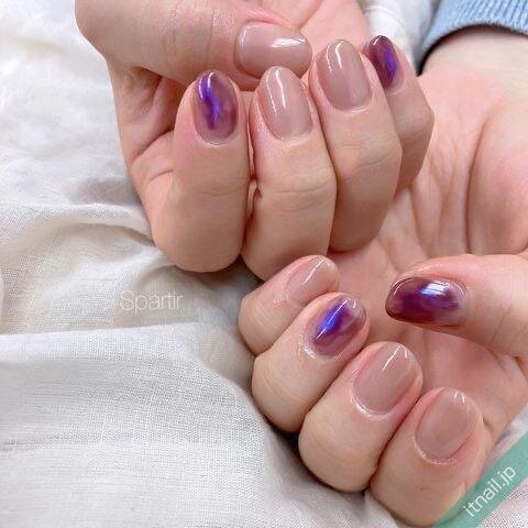 ニュアンス感を取り入れたいときはモヤっとカラーを取り入れると◎キッチリカラーを塗るよりラフな印象になります。パープルカラーをチョイスしてベージュネイルに柔らかく取り入れると、カジュアルでありながら幻想的な仕上がりに。