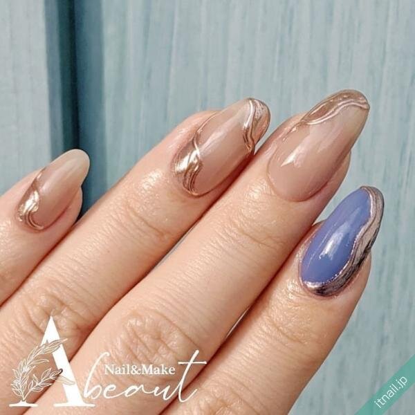 ブルーカラーを差し色に使ったベージュネイルはクールで洗練された雰囲気を楽しめます。ミラーアートをお爪それぞれにデザインして統一感を出すのも良いアイデア。差し色に使うカラーのチョイスは自由なので、普段はあまり選ばないカラーを選択してみるのも良い冒険になりそうです。