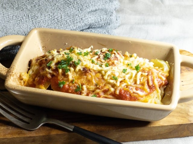 ② グラタン皿に①のじゃがいもを入れ、トマト&イタリアンチーズパスタソースをかけてシュレッドチーズを散らしてあれば粉チーズをかけ、トースターで7〜8分チーズがとろけて焼き色が付くまで焼いて、パセリを振ったら、完成です。