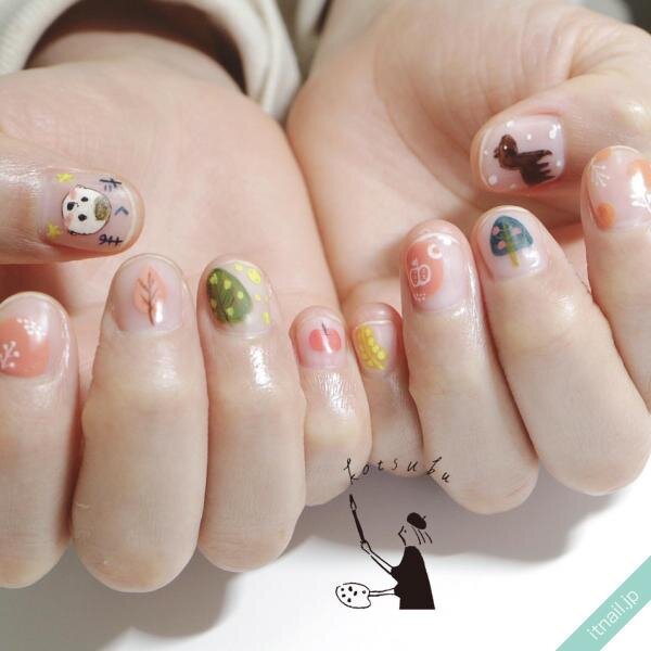 例えば、クリアベースのシンプルネイルをベースに、爪5本それぞれにお好みの柄をアートするデザインはいかがでしょうか。クリアベースならば、爪5本に違う柄をアートしても派手になりすぎることがないため、大人女子の皆様もチャレンジしやすいでしょう。