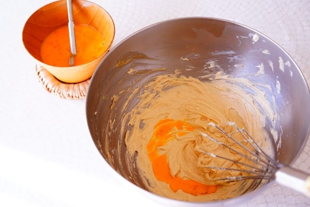 ② ①のボウルに溶いた卵を少しずつ入れて、(10回くらいに分けます)その都度しっかりと混ぜる。(少量ずつ混ぜれば、分離を防げます)