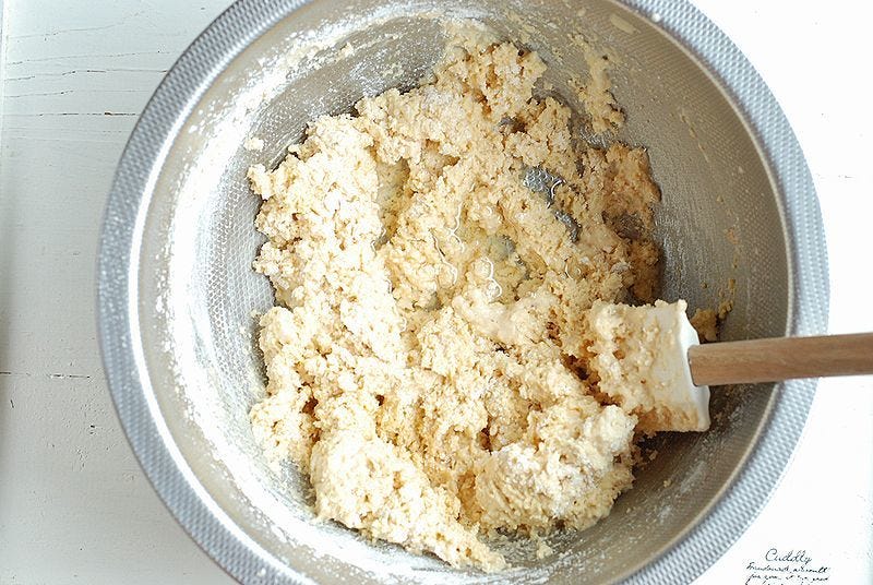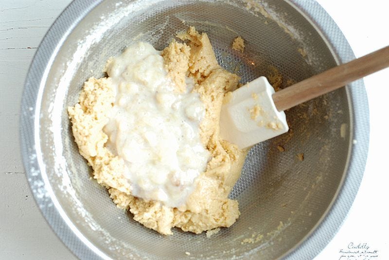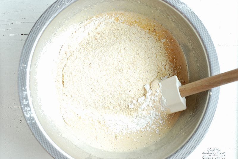 ③ 薄力粉とベーキングパウダー、おからを加えゴムベラで混ぜる。