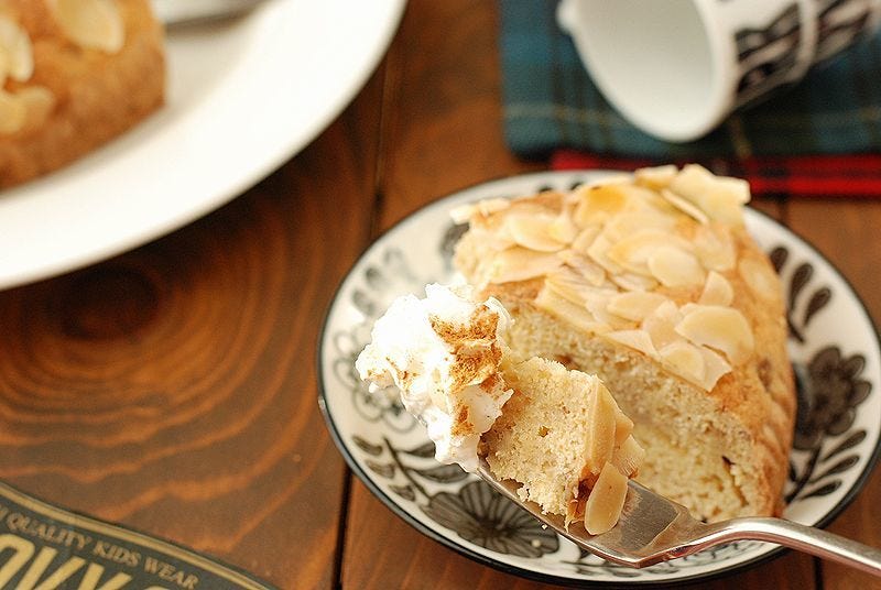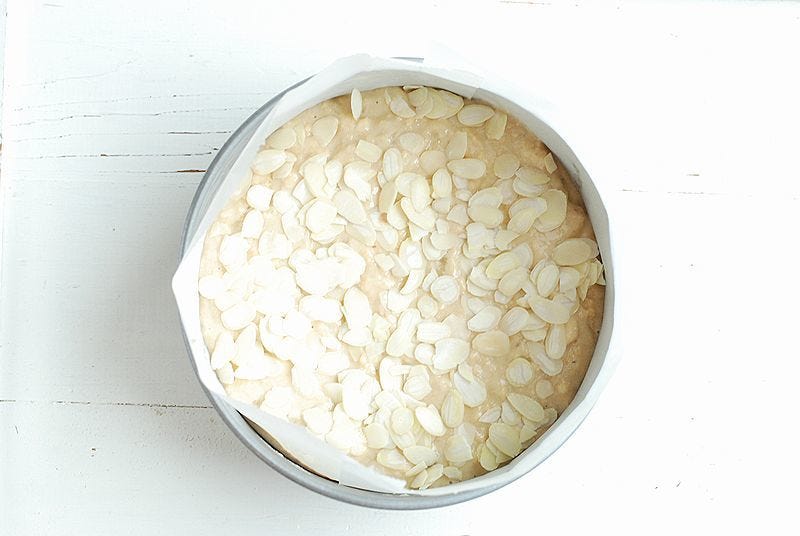 ⑥ 生地を型に流し入れ、上にアーモンドスライスをのせる。オーブンで約40分、中に火が通るまで焼く。