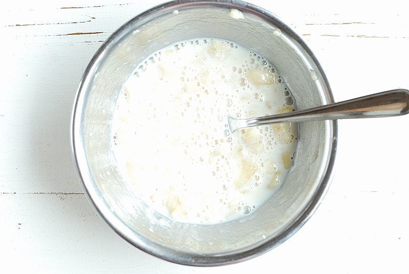 ① バナナをボウルに入れフォークで潰す。豆乳を加えよく混ぜる。