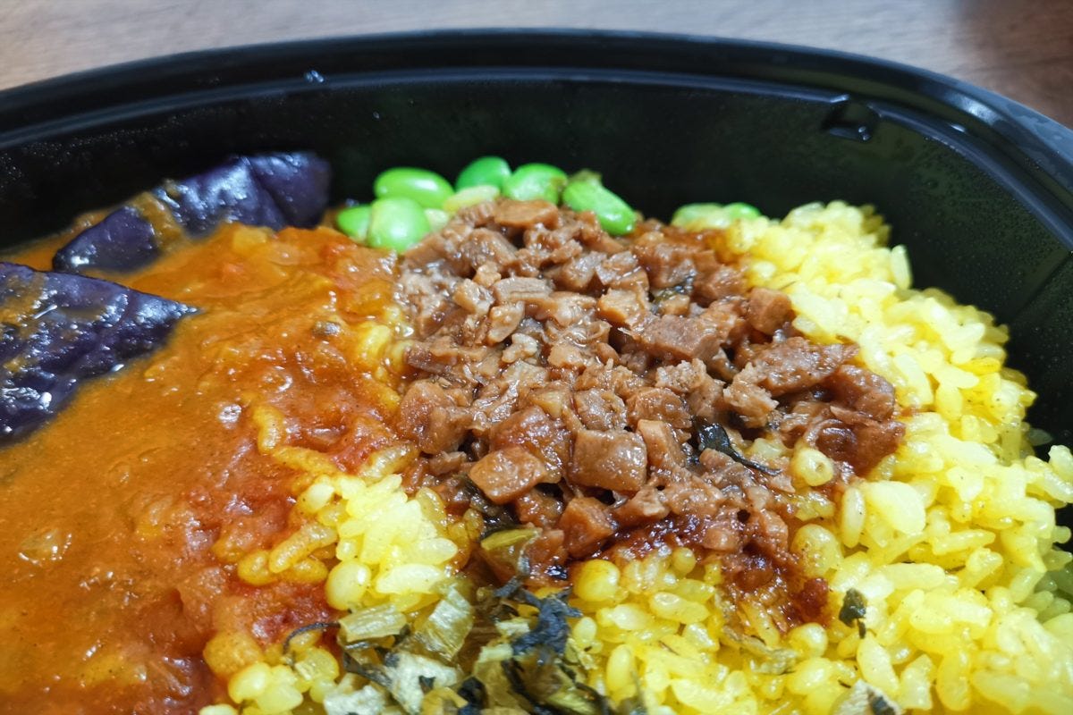 こ、これはめちゃくちゃウマそう! 魯肉飯の肉もたっぷりで、揚げナスや枝豆、アクセントの高菜もけっこうな量が入っている。