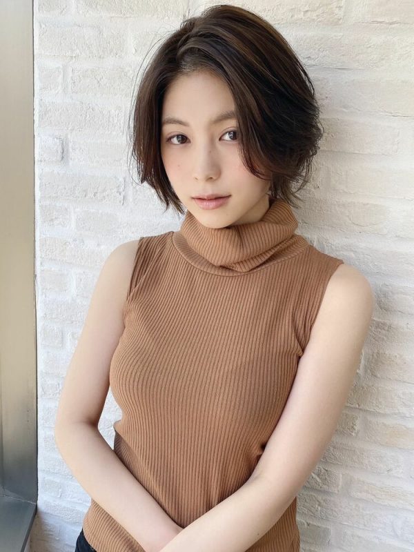 ハンサムなショートボブにかきあげ前髪を組み合わせることで、大人っぽいニュアンスのある表情が生まれます。