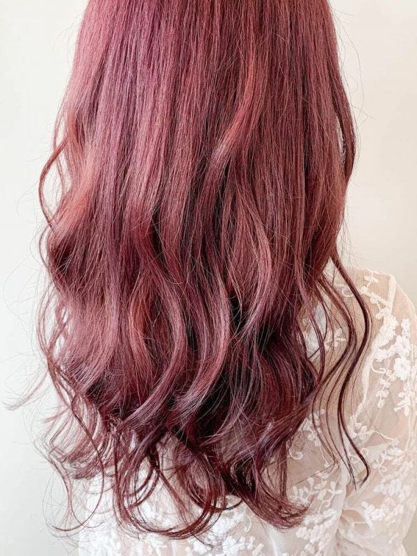 ゴージャスな色合いとロングのレングスを活かし、こて巻きパーマで軽やかなボリュームを出すのがおすすめ。より大人っぽく、女性らしい華やぎを演出できます。