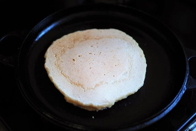 ⑤ 縁が固まり、底面に焼き色がついたら、ひっくり返します。
