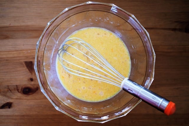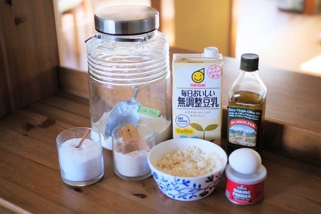 ① ボウルに卵を割り入れ、砂糖、塩、豆乳、植物油をくわえて、しっかり混ぜます。