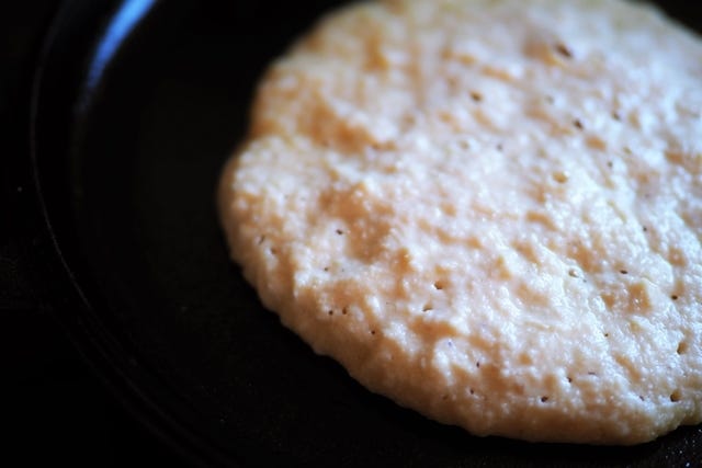④ フライパンを熱して、油(分量外)をひき、一度濡れ布巾の上に置いてから、コンロに戻し、生地を流し入れ、蓋をして、弱火で焼きます。