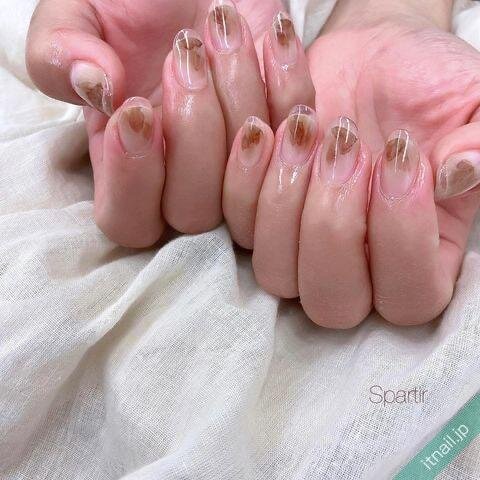 例えば、クリアベースのネイルに、透明感の異なるシースルーブラウンを数種類、ランダムに重ねるデザインはいかがでしょうか。クリアベースのネイルというと、春夏のイメージが強いかもしれませんが、こういった色味を使ったデザインならば、秋冬~春先に大活躍してくれますよ♪