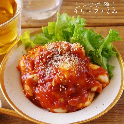 チリトマトささみは電子レンジでパパっと作れる人気のメインおかずです。
