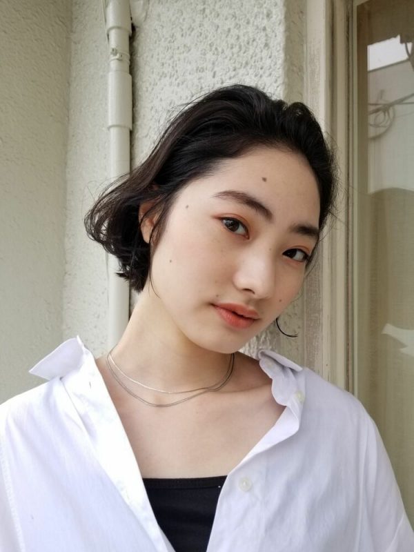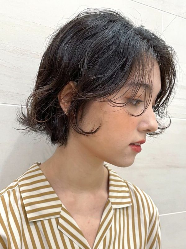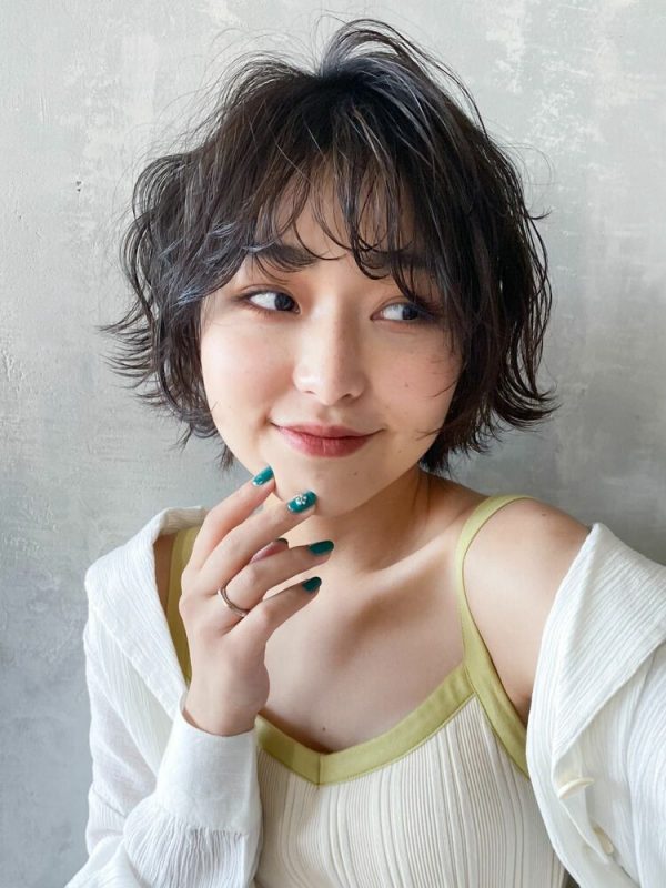 パーマのおかげで黒髪でも幼く見えないボブヘアに仕上がっていますね。