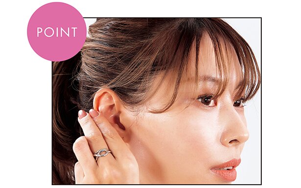 フェイスラインのお悩みや下がり目尻に効き目のあるヘアスタイル、ポニーテール。