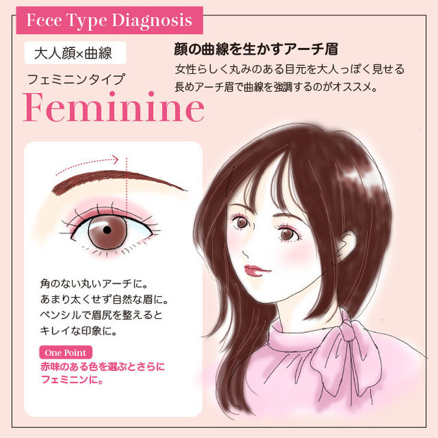女性らしく丸みのある目元が特徴のフェミニンさんは、カーブした優しい眉がお似合いです。長めのアーチ眉なら、顔の曲線を活かして印象的な目元を演出できます。