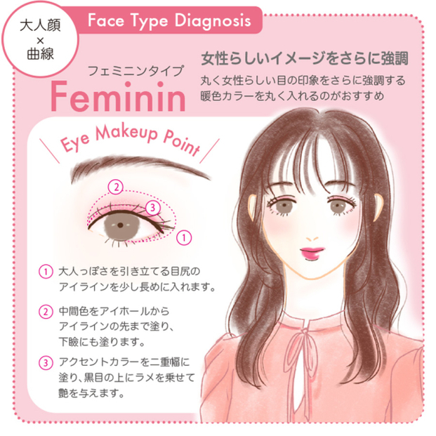 丸みのある瞳が特徴のフェミニンさんは、女性らしいイメージをさらに強調するピンク系のアイシャドウで目元を仕上げてみて。