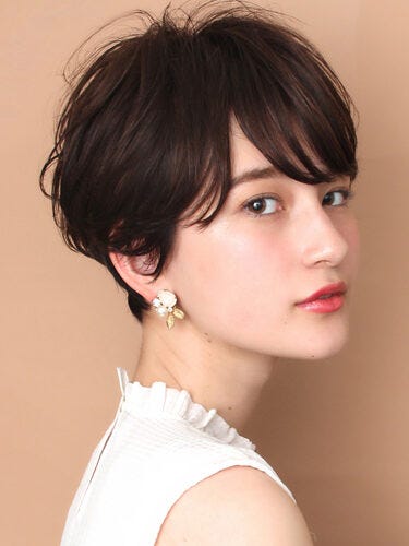 サイドを長めに残したショートヘアは顔周りをフレーミングして小顔見せする効果もあります。