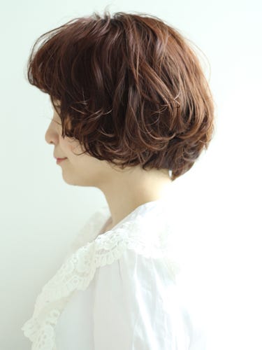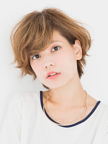 丸みのあるマッシュベースのショートヘアの前髪を流したおしゃれな髪型です。さりげないウェーブは、ゆるめのパーマで実現しています。