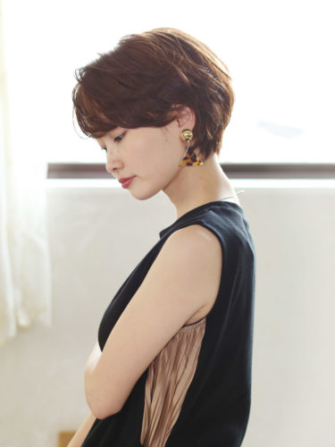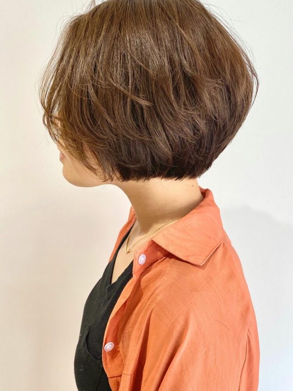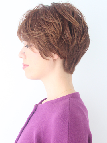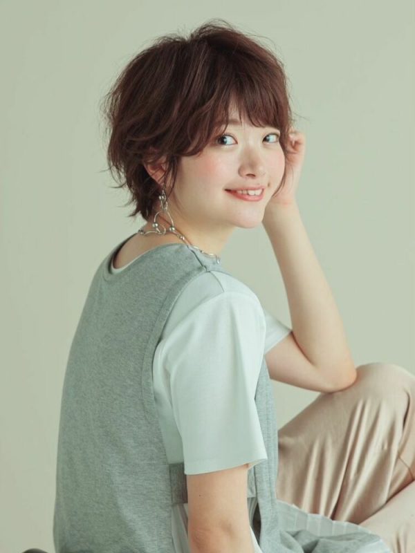 丸みのあるマッシュベースのショートヘアの前髪を流したおしゃれな髪型です。さりげないウェーブは、ゆるめのパーマで実現しています。