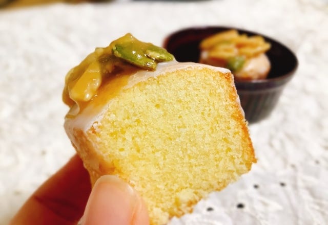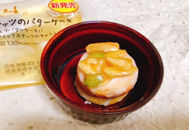 しっとりとしたバターケーキにミックスナッツをトッピングし、キャラメルをかけた商品。