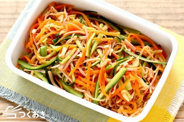 春雨を使った中華風サラダは回鍋肉献立に合う定番人気のサラダですが、野菜の量を増やしたいなら切り干し大根でアレンジしてみませんか?きゅうりや人参も使うので、彩りが綺麗でヘルシーに仕上がります。