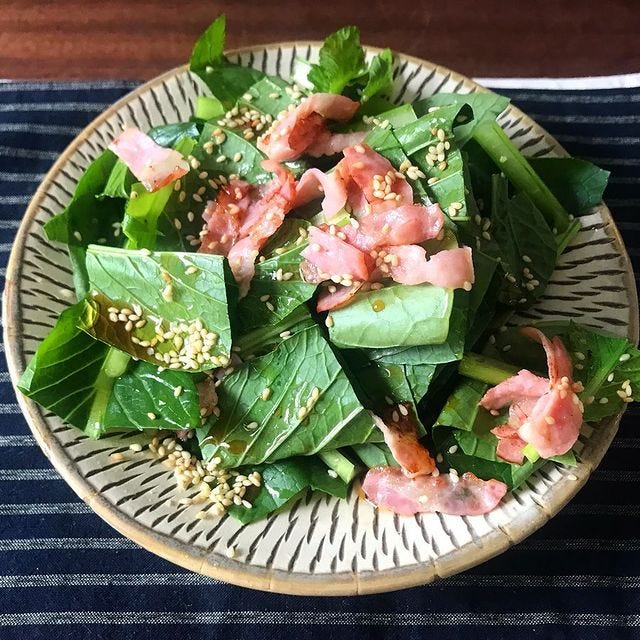 小松菜を洗ってざく切りにしたら器に盛ります。ベーコンをごま油で炒めたらめんつゆやごまを加え、油ごと小松菜にかけたら完成です。