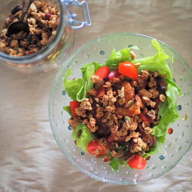 サラダにふりかけても、おいしい。グラノーラのカリッとした食感がくわわって、いつもサラダの満足度がアップします。