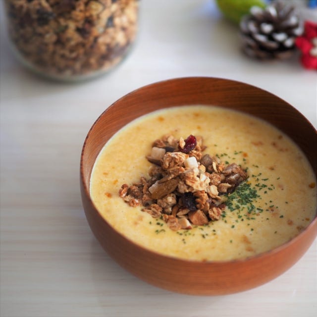 寒い朝には、スープにふりかけて食べるのもお勧めです。クルトン代わりのグラノーラと温かいスープで、ほっとする朝ごはん。
