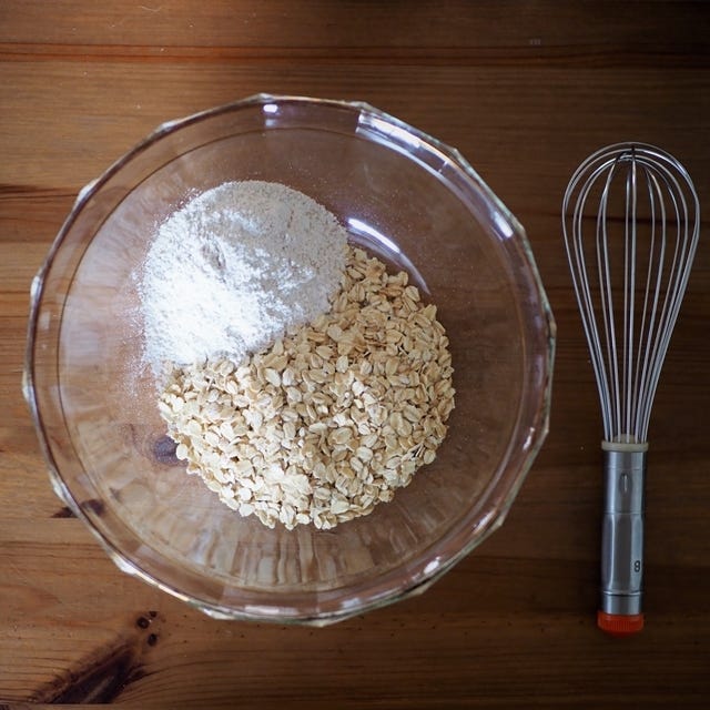 ① ボウルにオートミール、全粒粉、塩を入れて、混ぜます。