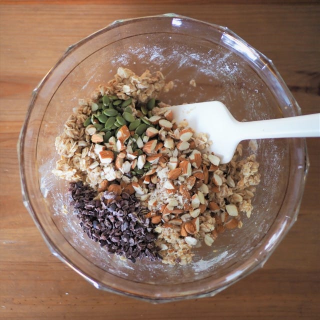 ③ ナッツとカカオニブをくわえて、混ぜます。