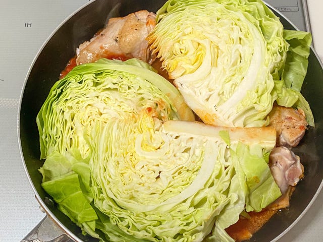 ③ こんがりと表面に焼き目がついたら、キャベツを並べるように入れ、トマト缶、ブイヨンを加えてフタをし、20分煮る。