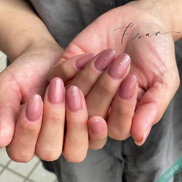 肌になじむくすみピンクで仕上げたシンプルネイルに、さりげなくラメを重ねて輝きをプラスしたデザインがこちら。ラメはポイントアートとして、数本のみに装飾したバランス感が素敵です。オフィスネイルのアレンジにもおすすめですよ。