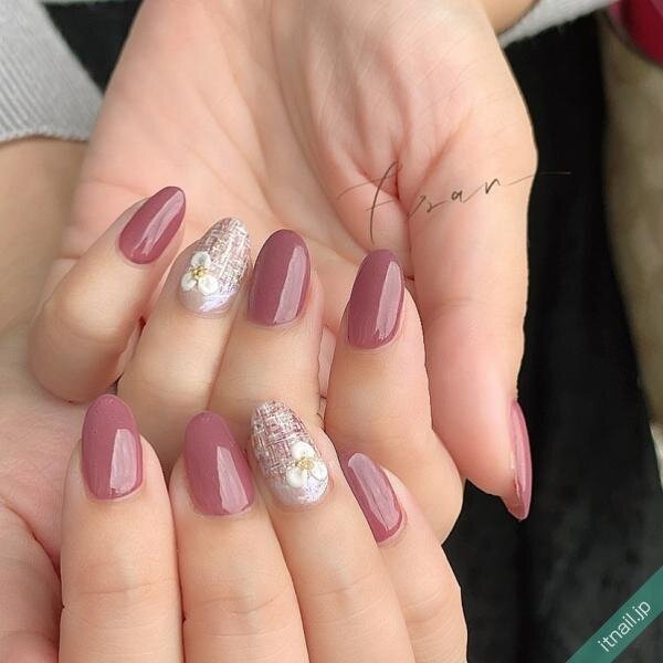 大人フェミニンを満喫するネイルアートの代表「ツイードネイル」は、くすみピンクと相性ぴったり。ポイントアートとして薬指に取り入れて、ガーリーな印象をまとってみませんか?立体的なフラワーのデコレーションもオシャレですね。