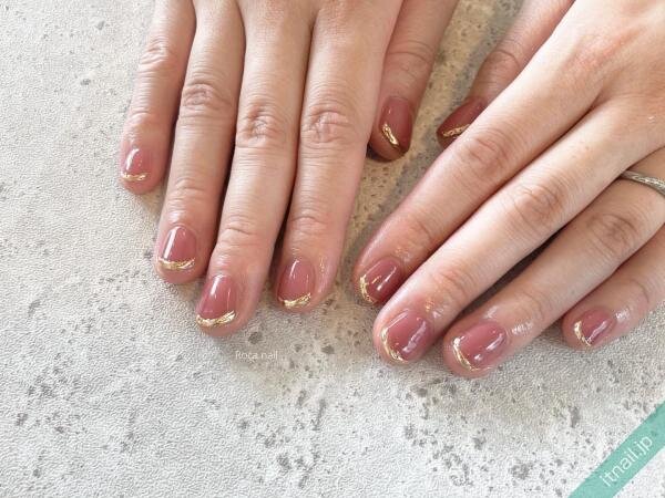 ショートネイルに施すくすみピンクネイルには、少しエッジーな要素を添えるのもおすすめです。こちらは爪先にミラーゴールドのラインを描いたスキニーフレンチネイル。洗練された大人の雰囲気はそのままに、メタリックな輝きがエレガントさも醸し出してくれます。