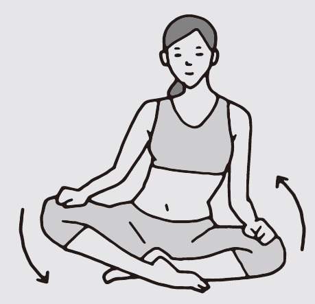 足を軽く開いて椅子に座り、右の足裏を内へ向ける。右脚のそけい部にこぶしを当て、親指以外の指の第二関節を押し当て揺らしながら10~20秒ほぐす。左側も同様に行う。