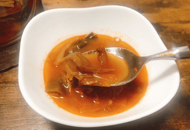 食べてみると、唐辛子の効いたピリッと辛味のあるスープがたまらなく美味しい!