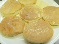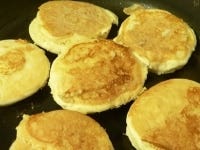 ミックス粉を牛乳か水で溶いて、フライパンに落としてパンケーキを焼く。焼き方は普通のホットケーキを焼く要領で。