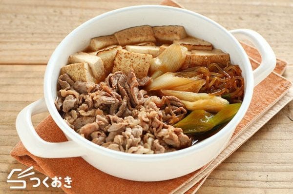牛肉、豆腐、しらたき、長ねぎといった材料を使っており、食べごたえがあって満足度の高いおかずです。調理は煮込み時間を合わせて、20分程で簡単に作れます。食卓で鍋料理としてみんなでワイワイ楽しむのもおすすめです。