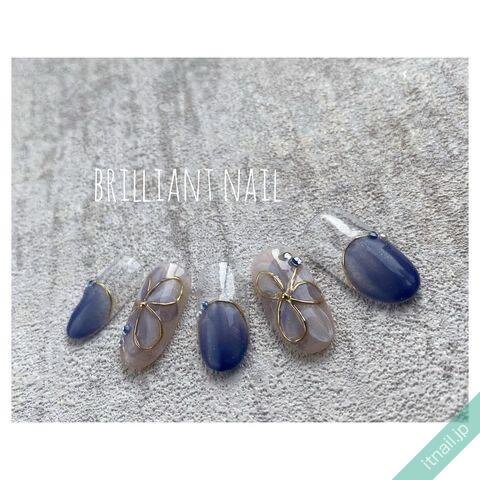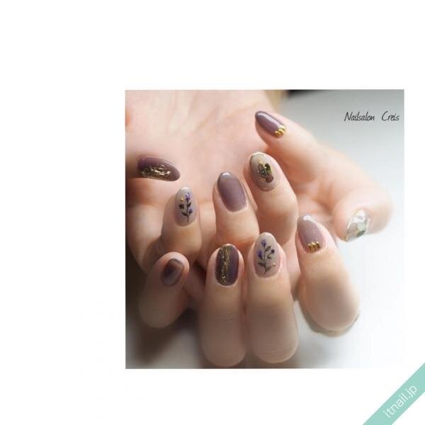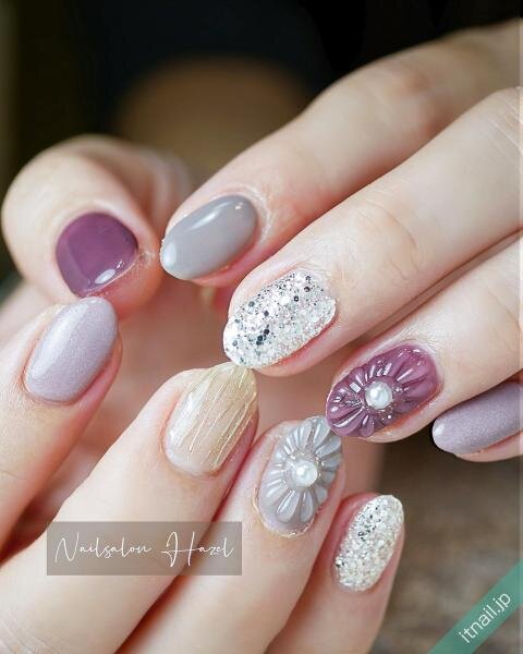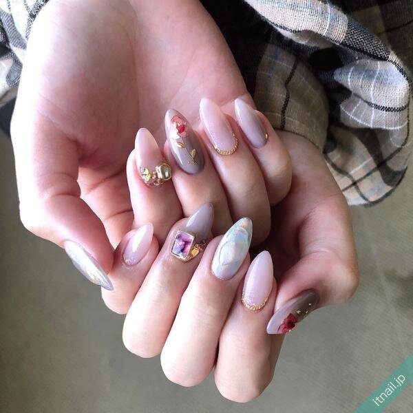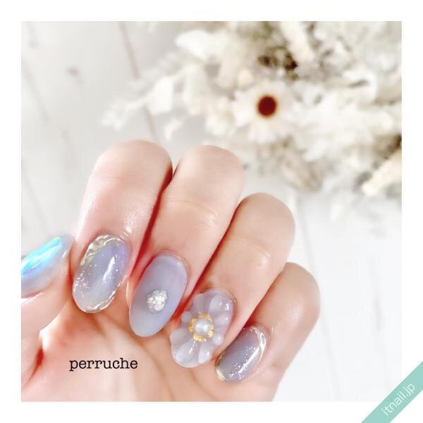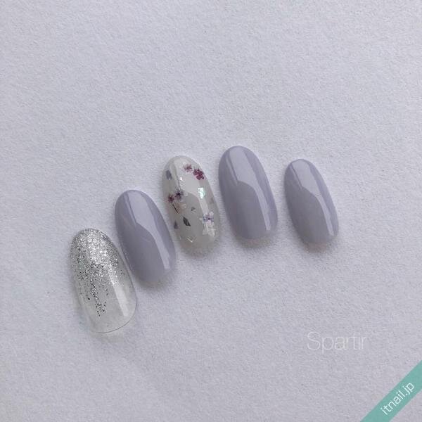 グレーやブルーグレーのネイルをはじめ、押し花もブルーにするなど、全体的に寒色系でまとめたデザインは儚げで透明感たっぷりのネイルになります。小さな押し花をランダムにのせているデザインがまたアンニュイで可愛いです。