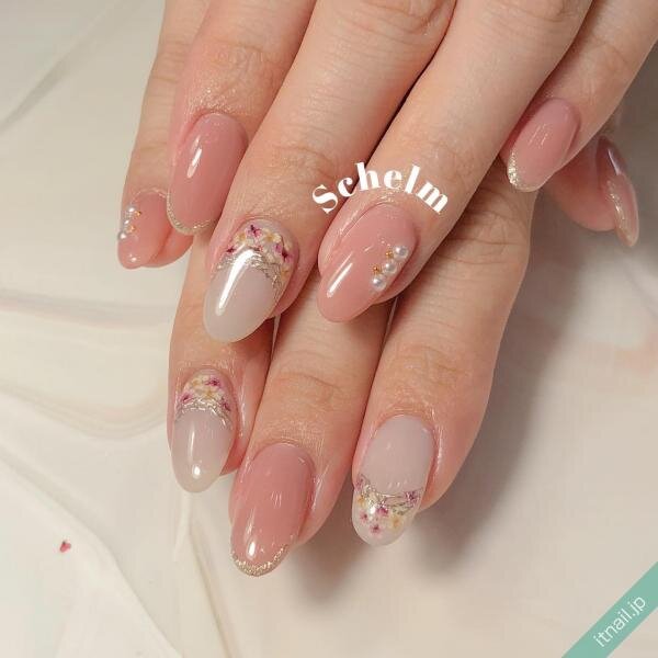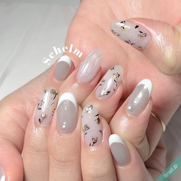 淡く柔らかいグレーネイルは、ふんわりと可愛らしいデザインが好みの方にぴったりです。他の爪や押し花にもピンクを入れてあげると、よりフェミニンな仕上がりになりますよ♪押し花のフレンチデザインは、綺麗めな印象も作ってくれます。