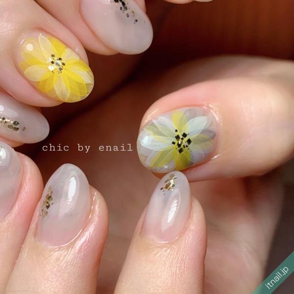 ゴールドミラーで縁取ったフラワーデザインは、アクセサリーのような華やかさのあるネイルに仕上がります。グレーのマーブル模様やタイダイ柄をベースにすると、儚げでおしゃれなムードがアップしますよ♪